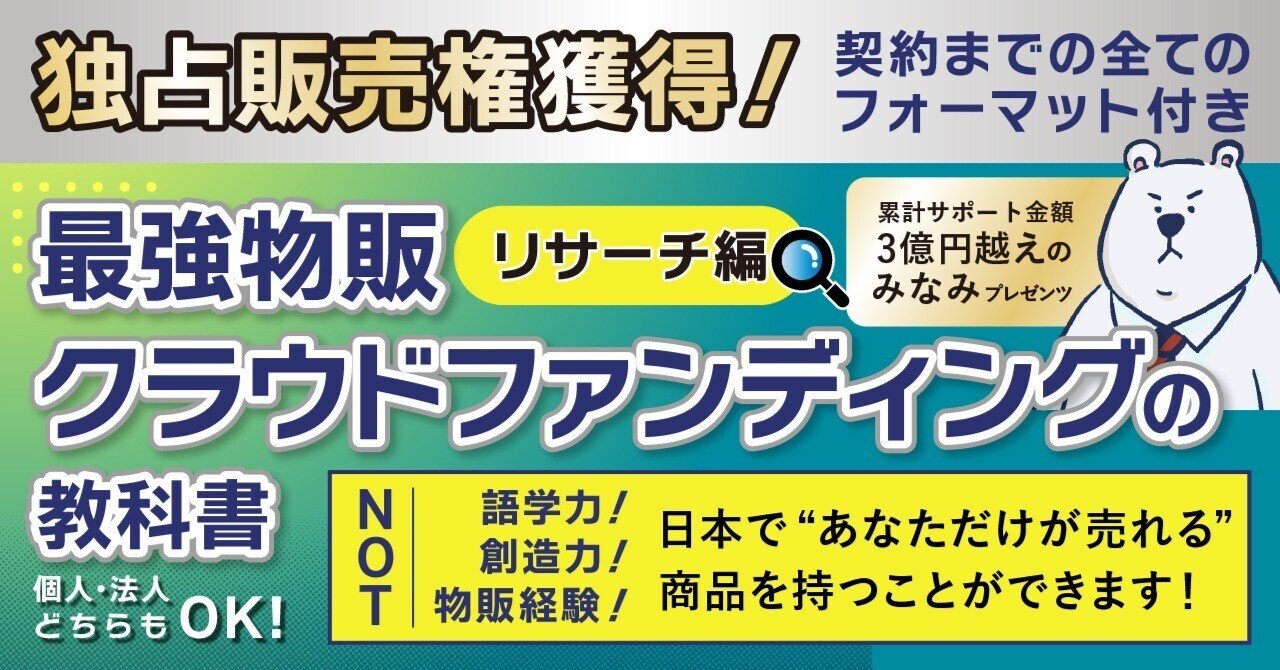 初心者の方も「売れる商品」の海外総代理店になる為の、本編である「クラファンの教科書 商品リサーチ編」が数量限定販売中です!